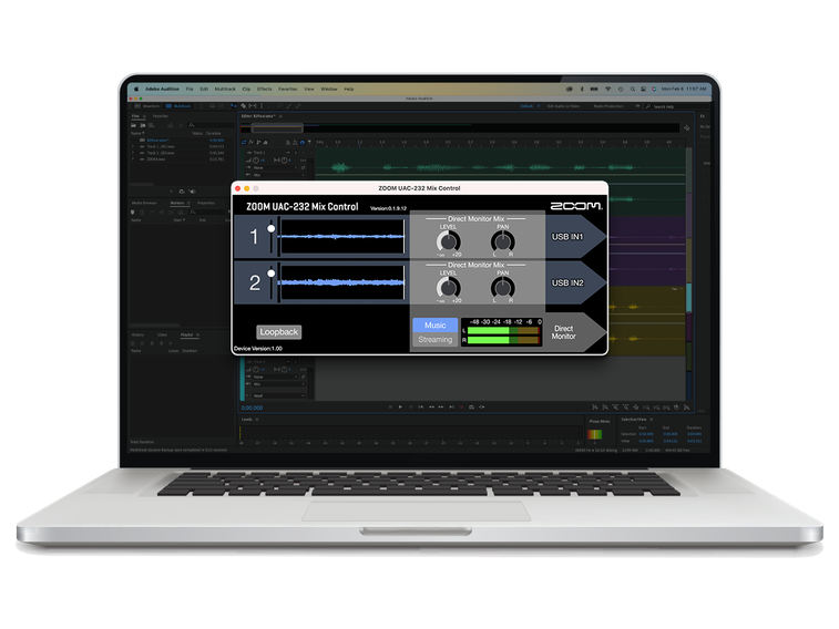Программное обеспечение UAC-232 Mix Control позволяет управлять маршрутизацией входов и выходов, включать функцию loopback, контролировать входные уровни и осуществлять их мониторинг. Вы также можете активировать режим Music, чтобы направить сигнал в DAW-программу или режим Streaming, который объединит все входы в единый сигнал для подачи на ПО для стриминга.